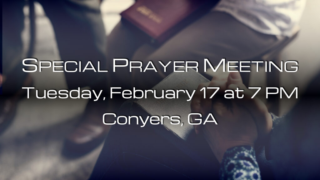 Tuesday, February 17, at 7 PM, we are going to have a special prayer meeting at our old Conyers property. I hope that you will join us as we begin 40 days of prayer and fasting ahead of our scheduled revival meeting with a time of singing, testimony, and praying for God’s guidance and blessing on our church. The address is: